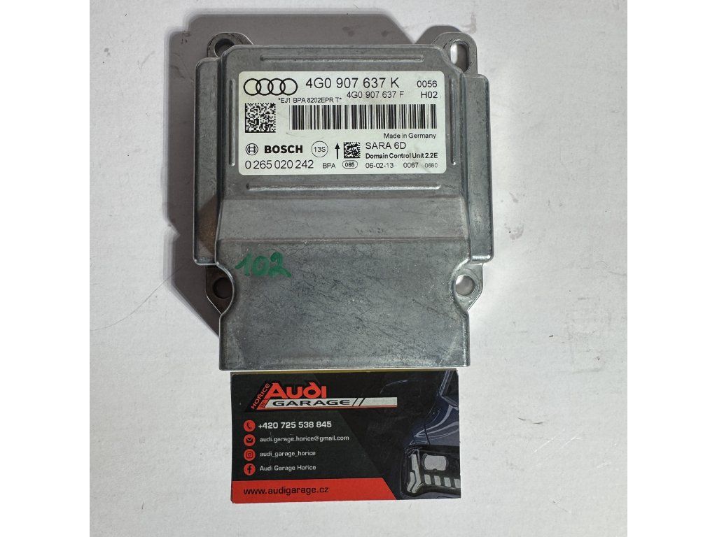 Použitá originální řídící jednotka airbagů SARA 6D Domain Control Unit 2.2E. Číslo dílu: 4G0 907 637 K (HW: 4G0 907 637 F). Výrobce: Bosch (0 265 020 242). Made in Germany. Vhodné pro Audi A6 C7 (4G) a Audi A7 (4G).