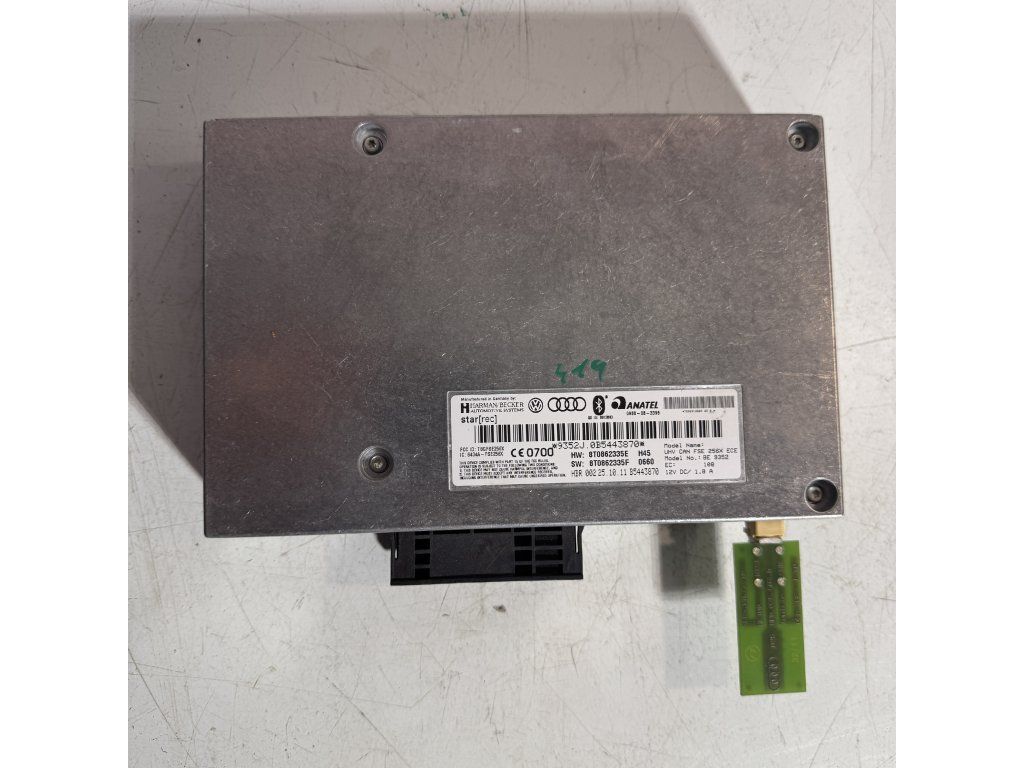 Originální modul Bluetooth hands-free s OEM číslem 8T0862335E (8T0 862 335 E). Výrobce Harman/Becker, Germany. Zajišťuje bezdrátové připojení telefonu, hlasové ovládání a přehrávání zvuku přes palubní systém. Vhodné pro Audi A5 8T, Audi A5 Sportback, Audi A5 Cabriolet, Audi A4 B8, Audi A4 B8 Avant, Audi Q5 8R. OEM: 8T0 862 335 E.